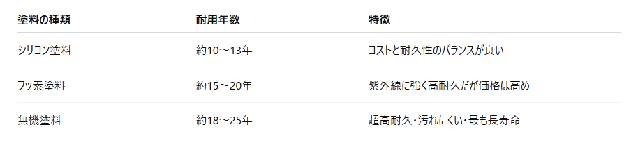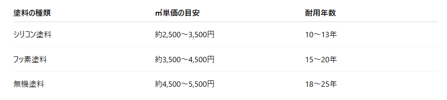 このような疑問を持つ方にとって、塗料の違いを理解することは判断材料になります。以下は、代表的な塗料ごとの㎡単価と耐用年数の目安です。