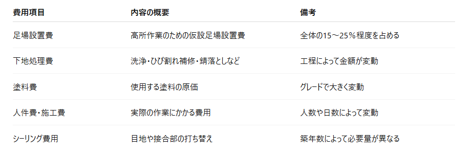 実際に見積もりを取ると、単に塗料代だけでなく、さまざまな項目が加算されています。費用を正しく把握するには、内訳の内容を理解しておくことが重要です。